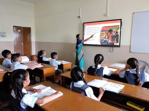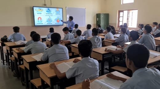 well-ventilated classrooms with Interactive Boards linked to the school server where teachers integrate technology into the learning .These interactive boards help the students understand the concepts through video clippings, 3D diagrams and simulated experiments. Animated pictorial representation helps the teachers to explain with ease difficult concepts to the students.